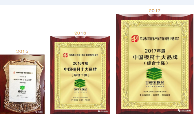 2015、2016、2017百的寶板材連續(xù)三年成功蟬聯(lián)了“中國板材品牌”榮譽,