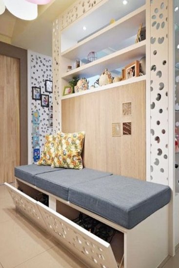 剛進門就是客廳?這時候你就需要一個圖片上的玄關(guān),下面是鞋柜,上面做成收納各自,可以放些古玩和植物,既美觀又起到了格擋的作用,增加了客廳的空間感,私密感還不影響通風(fēng)透光。
