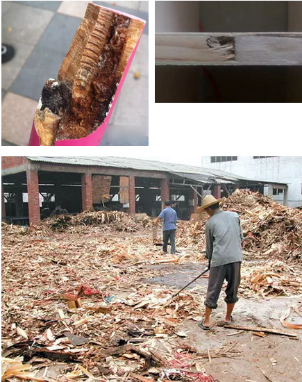 據業內人士透露,“黑心板材”是黑心廠家為了節約成本,從木材廠收來廢舊木料,有些甚至是腐爛的、被焚燒過的碎木,經過工人們拋光翻新之后,灌注膠水,通過冷壓制成的。