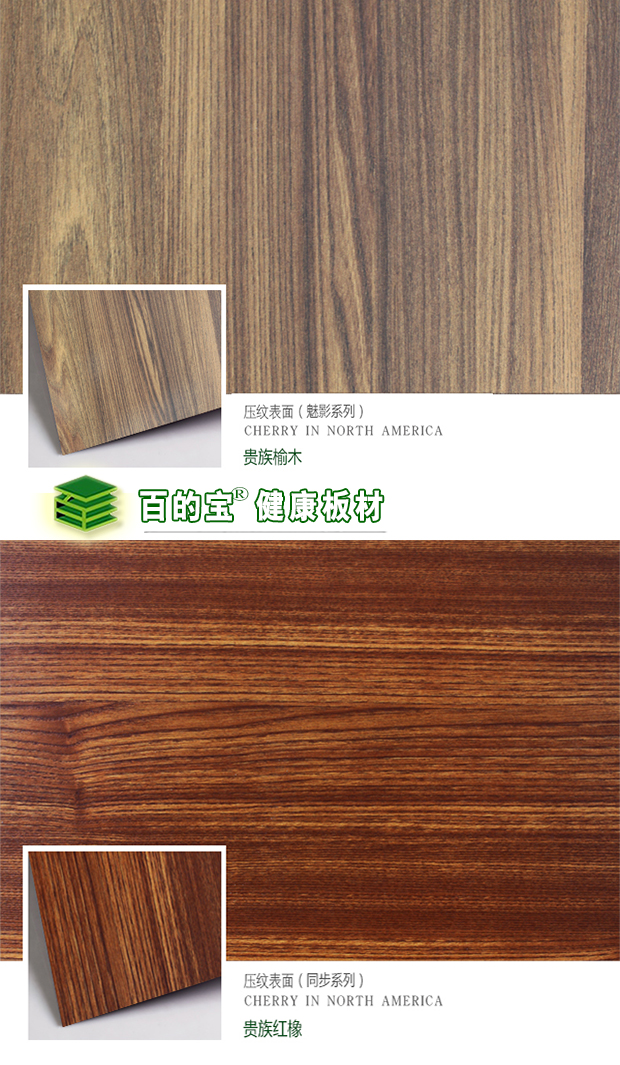 健康板材品牌百的寶的三聚氰胺板(生態板)可以任意仿制各種圖案,色澤鮮明,用作各種人造板和木材的貼面,硬度大,耐磨,耐熱性好。