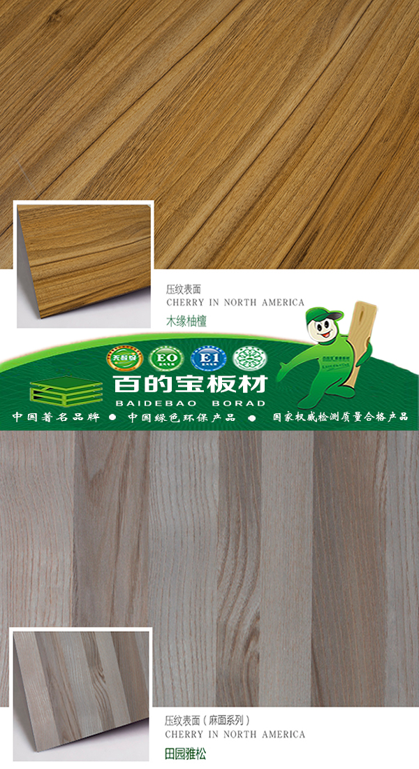 百的寶生態(tài)板的花色種類多,色彩絢麗。免漆、耐磨、耐高溫、耐腐蝕、防水防潮、握釘力好、環(huán)保、低碳、表面也不會變色或起皮,具備許多天然木材所不能兼?zhèn)涞膬?yōu)異性能。用它打制的家具不必上漆,表面自然形成保護膜,耐磨、耐劃痕、耐酸堿、耐燙、耐污染。環(huán)保美觀。