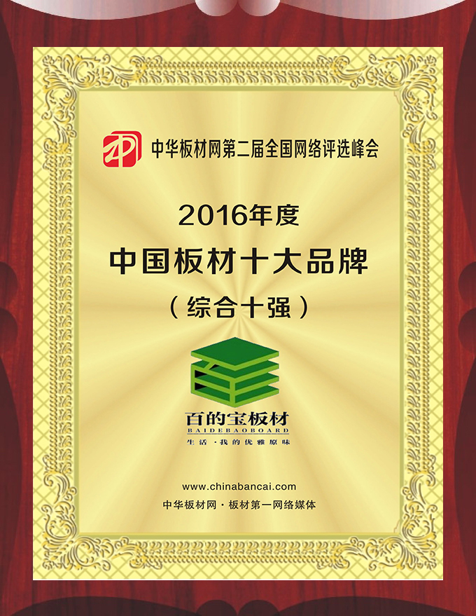 本次評選活動參選的品牌企業云集,競爭激烈,經過激烈的角逐,而百的寶板材能連續三年將“中國板材品牌綜合十強”的榮譽收入囊中既是實力雄厚,也是消費者的信賴!