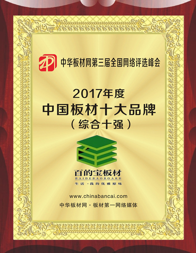 在品質上嚴格要求、在品牌形象上嚴格管理,兩手抓兩手硬的優良作風讓百的寶板材獲得了不俗的市場口碑,并連續多年獲得“中國板材品牌‘榮譽。